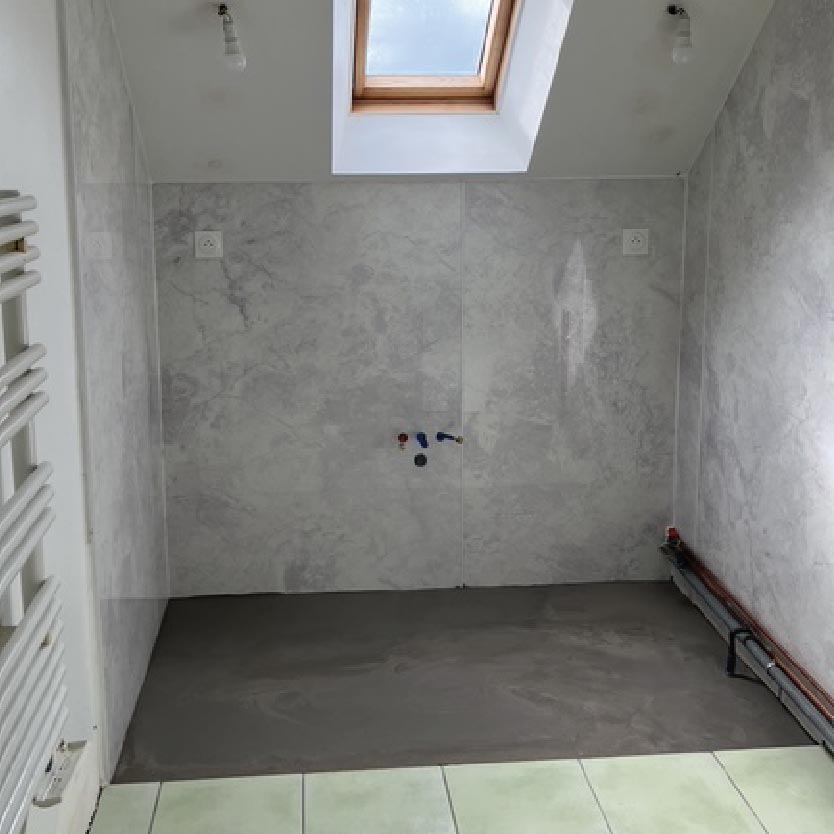 Pour ce faire, nous avons posé un receveur extra-plat en béton de synthèse, posé deux panneaux muraux Vipanel marbre blanc rosé pour s’accorder avec la faïence, un retour fixe avec porte battante pour un accès facilité.